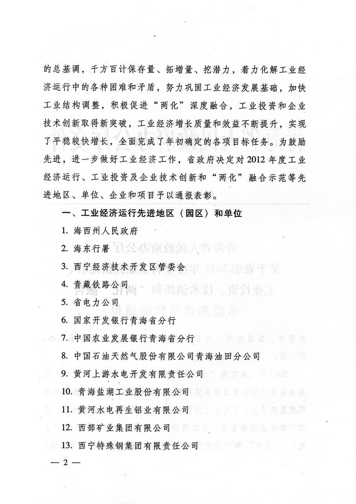 2012年,青海省物產(chǎn)集團總公司在省委、省政府及省國資委的大力支持和領(lǐng)導(dǎo)下,集團總公司按照全省工業(yè)經(jīng)濟總體部署和要求,著力推進工業(yè)項目建設(shè),榮獲"2012年度工業(yè)投資貢獻獎"。